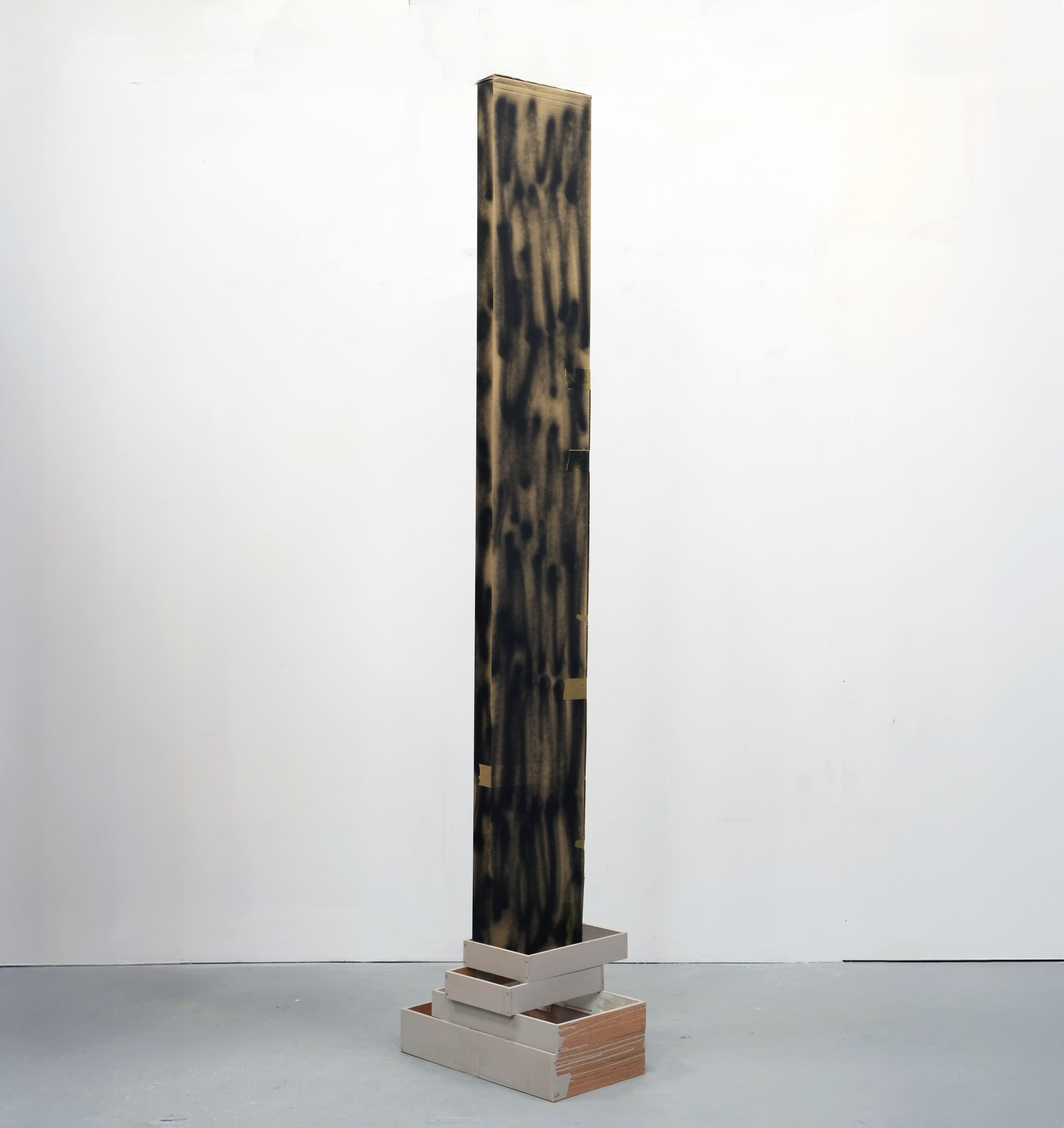 Sans titre, 2023, contreplaqué, peinture acrylique, papier miroir et peinture aérosol argenté, 52 x 35 x 28 cm