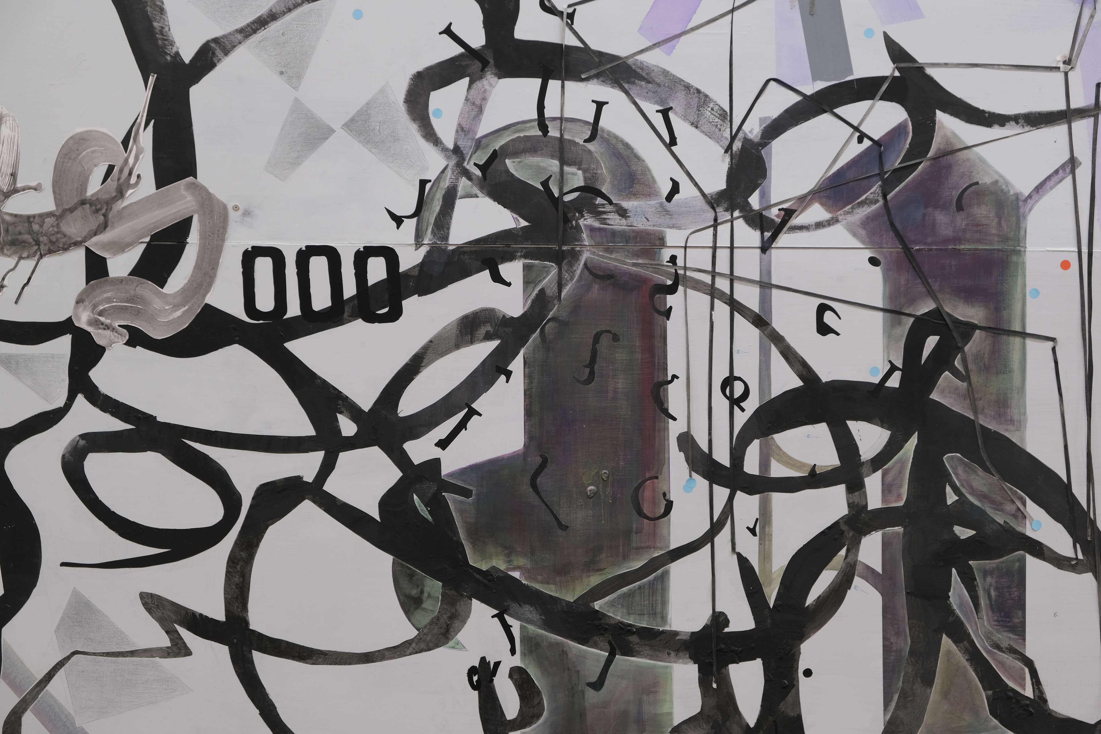 Sans titre, 2023-2024, peinture acrylique, pastel à l’huile, peinture aérosol et vynil adhésif sur mdf, 140 x 174 cm