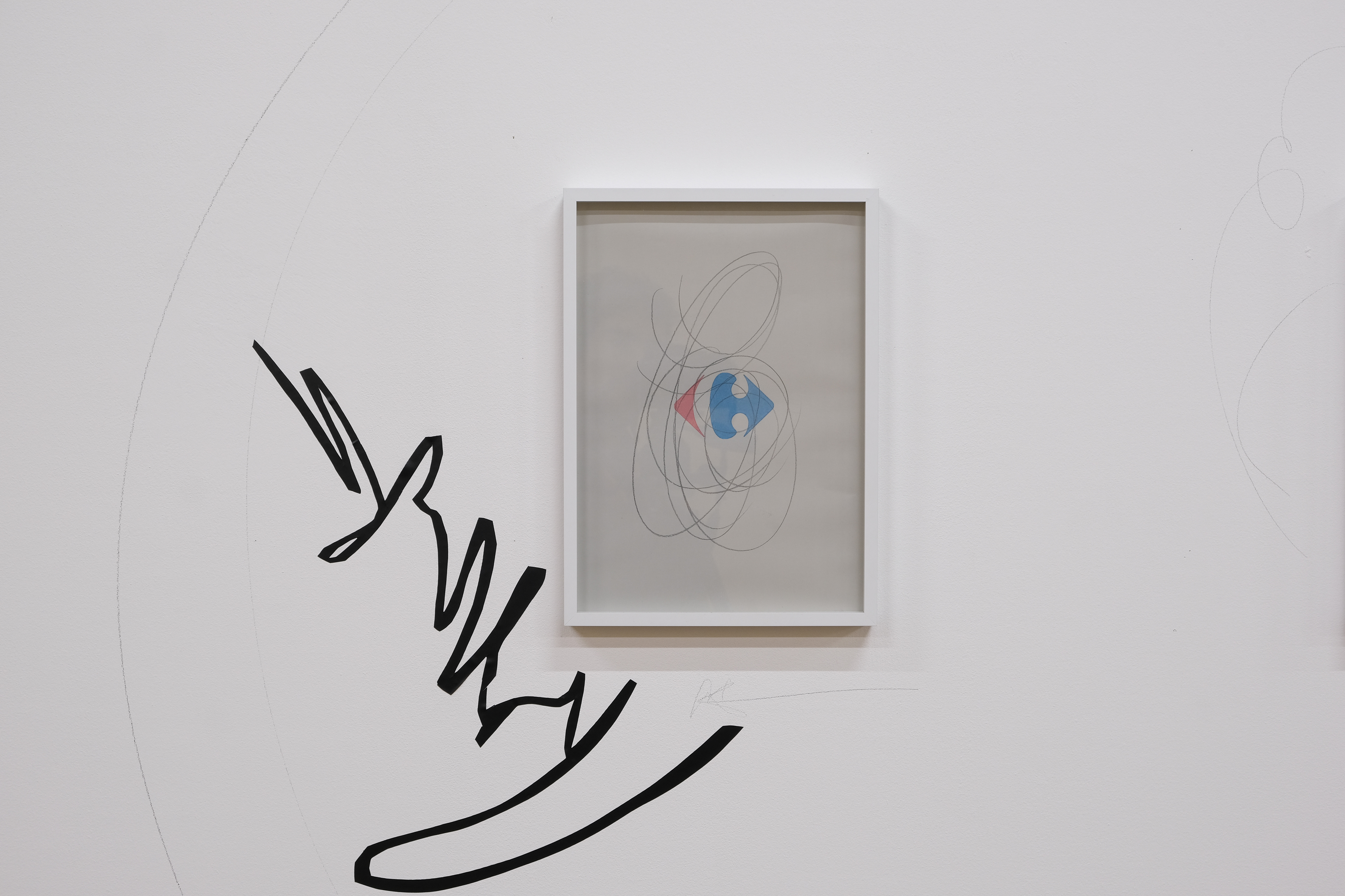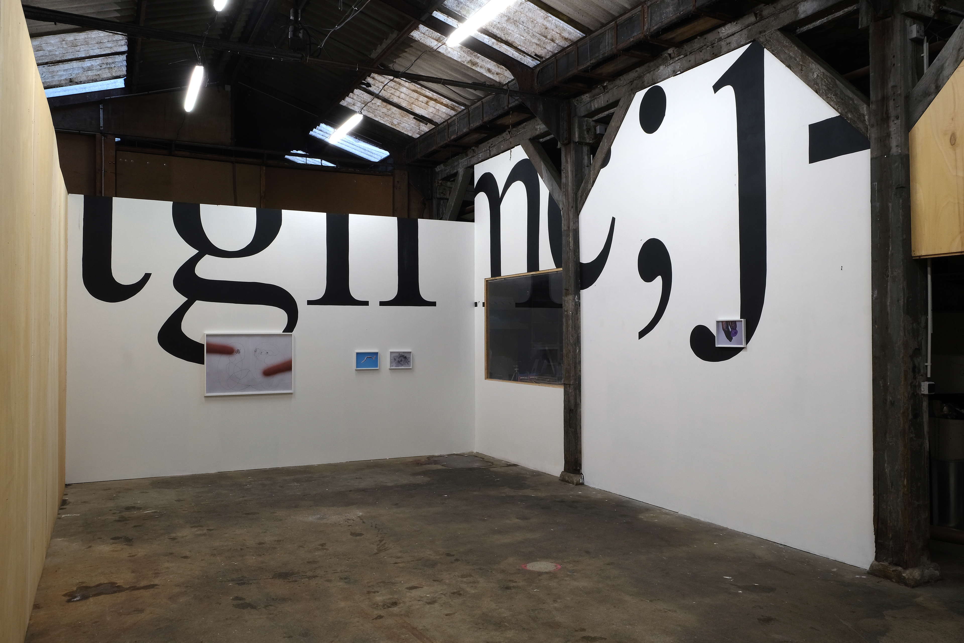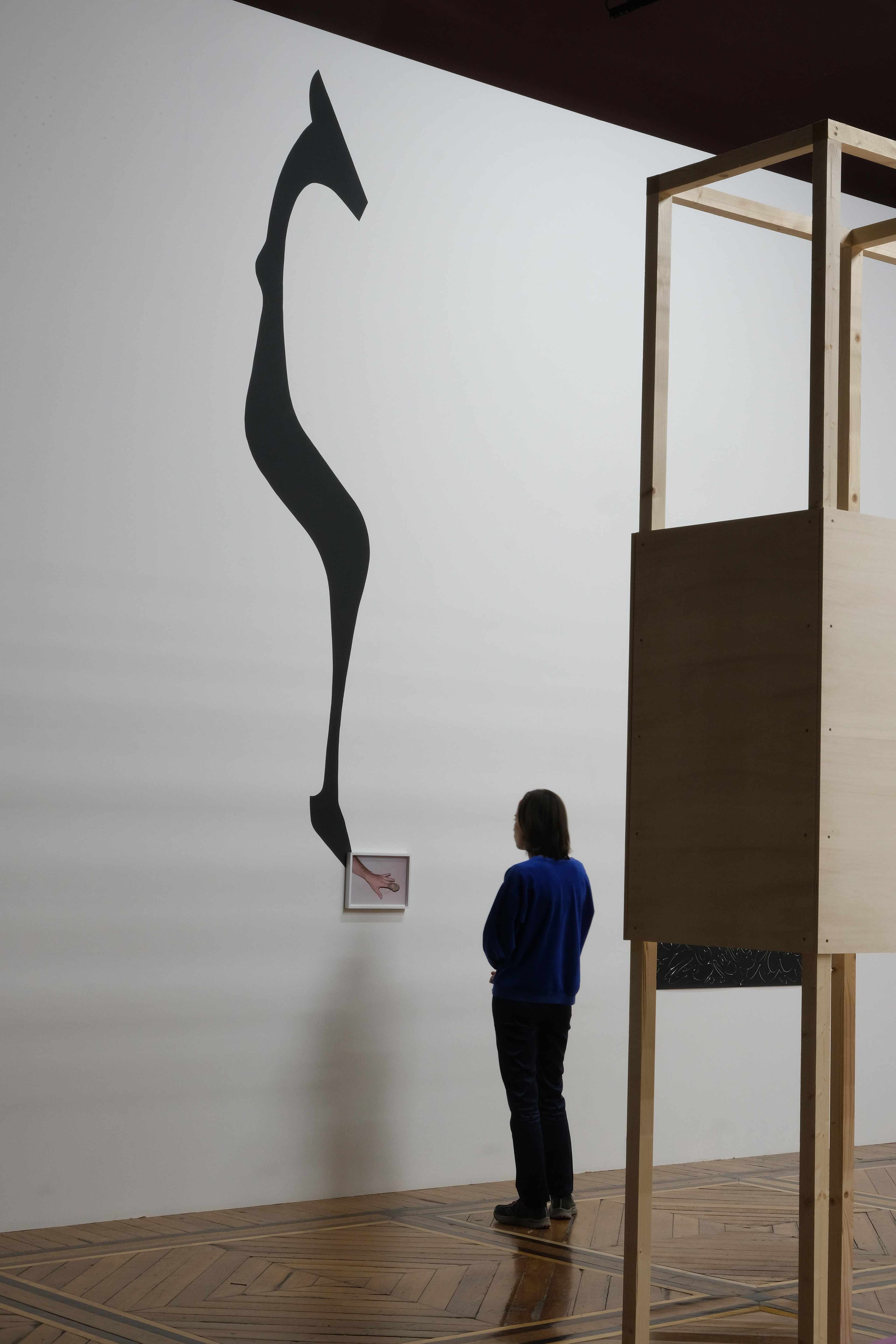 Depuis mes yeux, j’ai la pince désarticulée, H, comme la lettre 0 le bout des doigts violet - tgnçùmc;j-, 2021, peinture acrylique et photographies encadrées, 400 x 550 x 800 cm